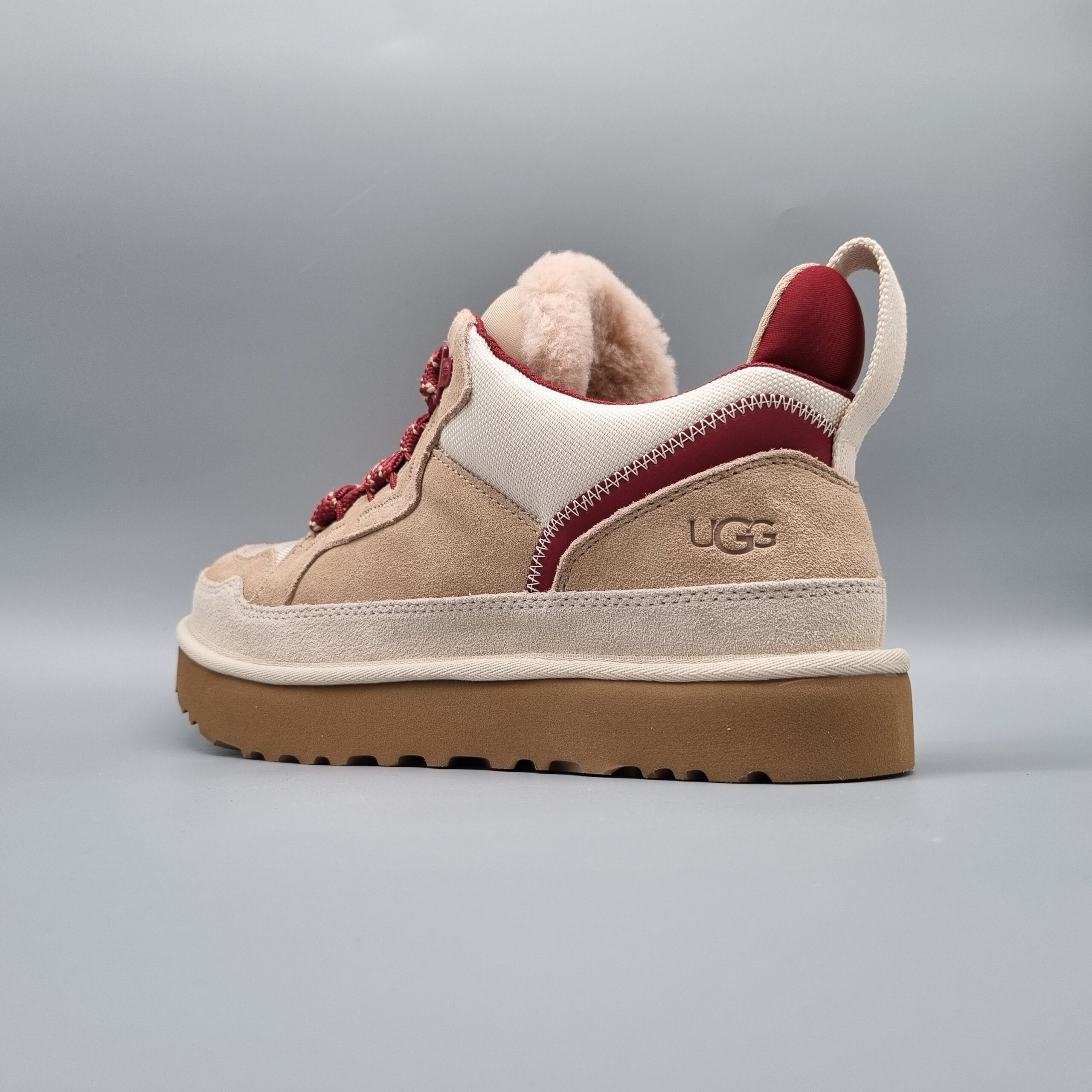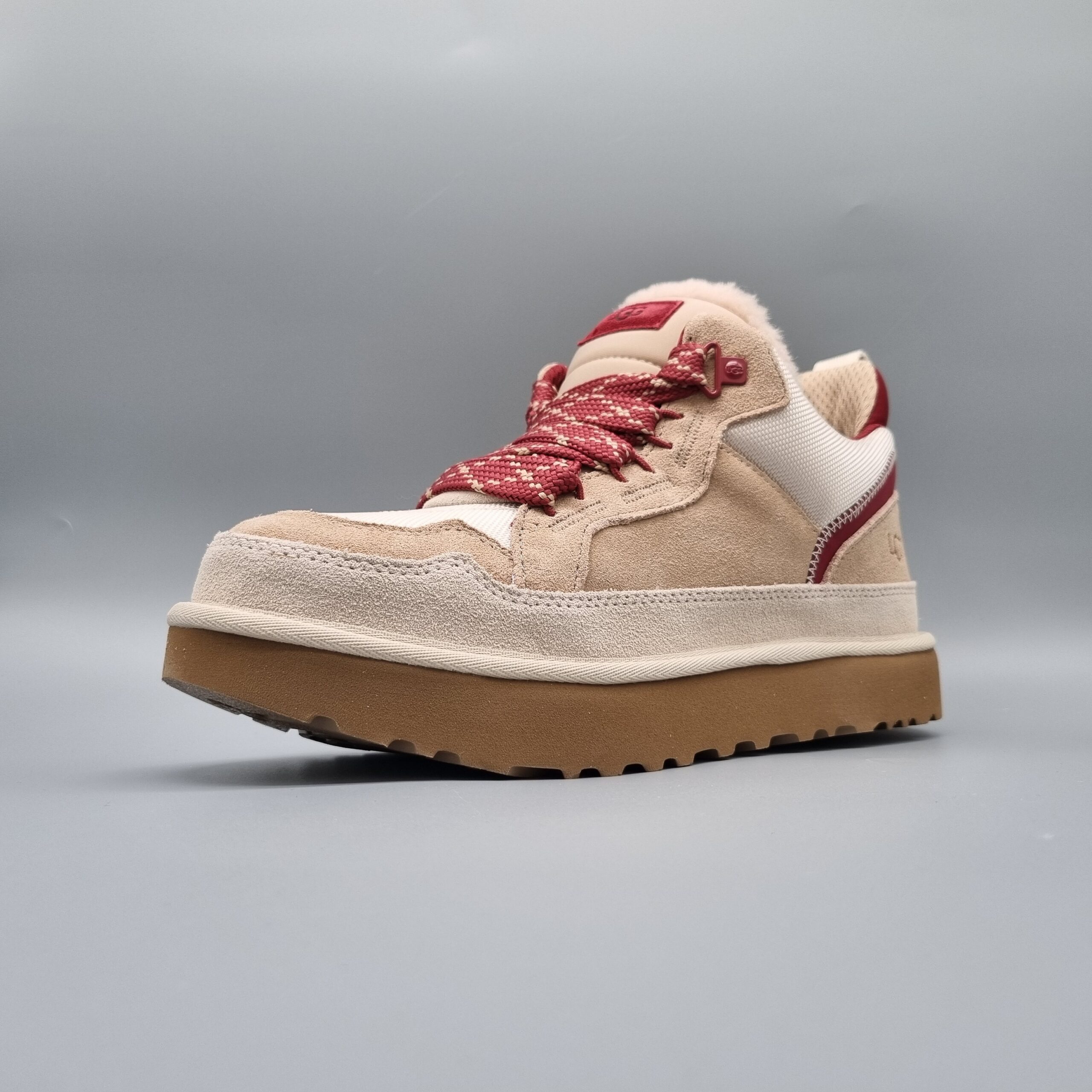 Der UGG Lowmel Driftwood Biking Red zeigt braune und rote Akzente in moderner Zweiton-Optik. Innenfutter bietet Komfort, die profilierte Sohle Stabilität. Ein auffälliger Sneaker für Alltag und Freizeit.